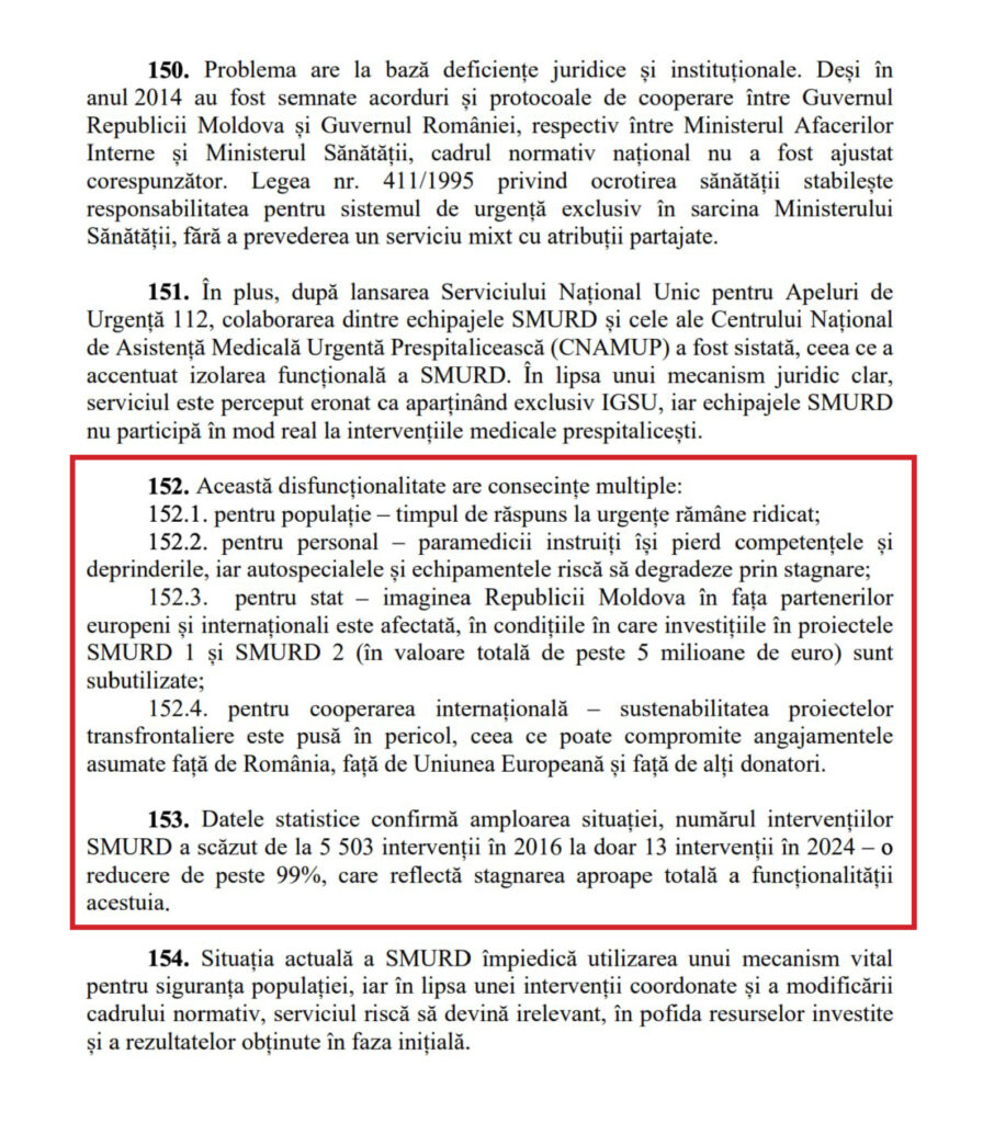 O bătălie de orgolii: Blocajul nu este unul tehnic, ci unul de autoritate publică între Ministerul Afacerilor Interne (IGSU) și Ministerul Sănătății (CNAMUP). Din cauza Legii 411/1995, paramedicii sunt blocați juridic să acorde ajutor medical pre-spitalicesc, fiind priviți mai degrabă ca niște „intruși” în sistemul medical al Republicii Moldova.