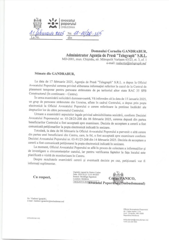 Sesizarea ar fi fost depusă pe 15 ianuarie 2025, iar ulterior analizată de Oficiul Avocatului Poporului. Pe 6 februarie 2025, instituția ar fi emis o decizie privind admisibilitatea cererii și a început procedurile necesare pentru investigarea situației.