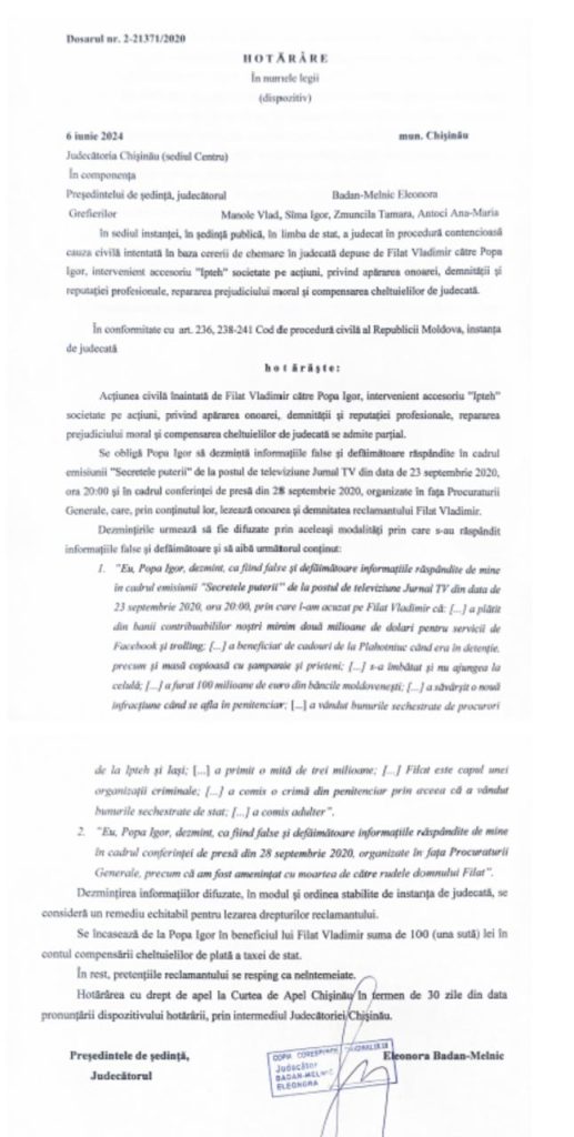 Astfel, Igor Popa a fost găsit vinovat de lezarea onoarei, demnității și reputației fostului său client obligat să dezmintă fiecare afirmație calomnioase în parte, în aceleași surse de informare în masă.