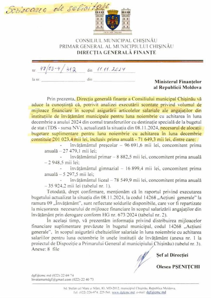 „Menționez că toate obligațiile salariale față de angajații din sistemul educațional vor fi respectate. În următoarea ședință de Guvern va fi aprobată rectificarea bugetului de stat, care prevede alocarea resurselor financiare suplimentare pentru toate autoritățile publice locale. Procedura de rectificare este una standard și are loc în fiecare an. Municipiul Chișinău va primi suma de 39 de milioane de lei, resurse suficiente pentru onorarea tuturor obligațiilor financiare până la sfârșitul anului curent”, a precizat oficialul.