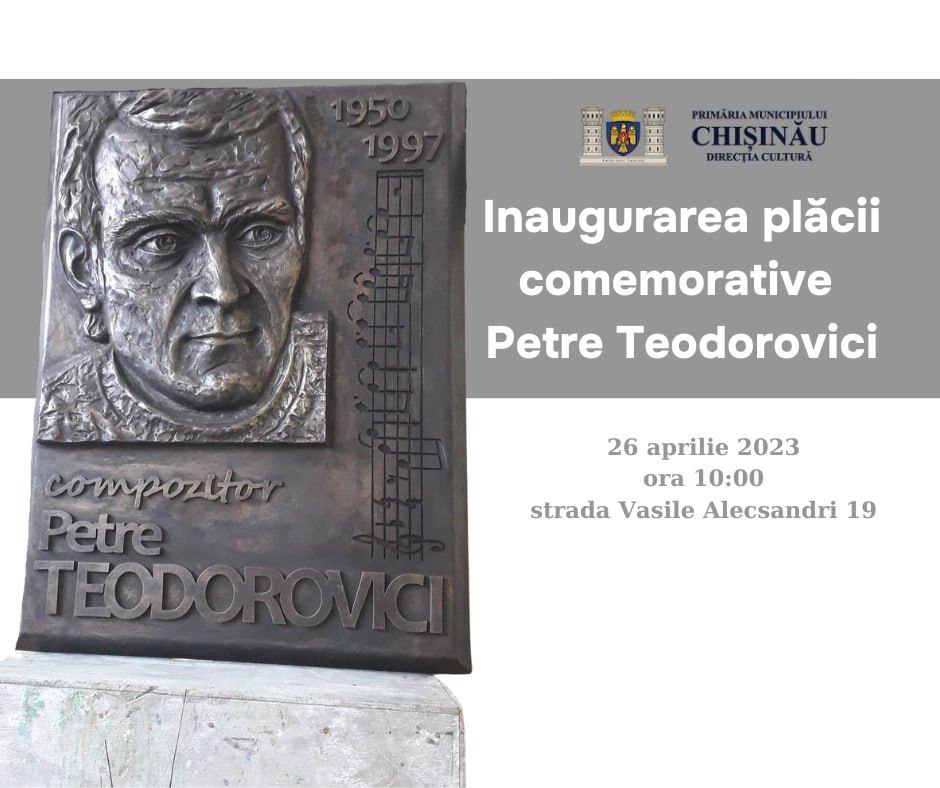 O placă comemorativă dedicată compozitorului și interpretului Petre Teodorovici, fratele mai mare a lui Ion Aldea Teodorovici, va fi inaugurată la Chișinău, anunță Primăria Capitalei. Placa va fi instalată pe casa în care a locuit vestitul compozitor, de pe strada Vasile Alecsandri 19. La evenimentul care va avea loc în data de 26 aprilie, ora 10:00, vor fi prezenți membri ai familiei compozitorului, dar și interpreți care au colaborat cu acesta, precum Gheorghe Țopa și Lidia Botezatu.