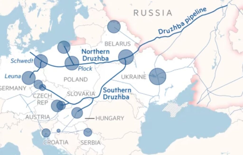 În ultimii ani, Germania a redus semnificativ dependența de petrolul rusesc, însă a continuat să importe țiței din Kazahstan prin ramura nordică a conductei Drujba, care traversează Polonia. Aceste livrări au fost afectate periodic de atacuri cu drone asupra infrastructurii din Rusia.