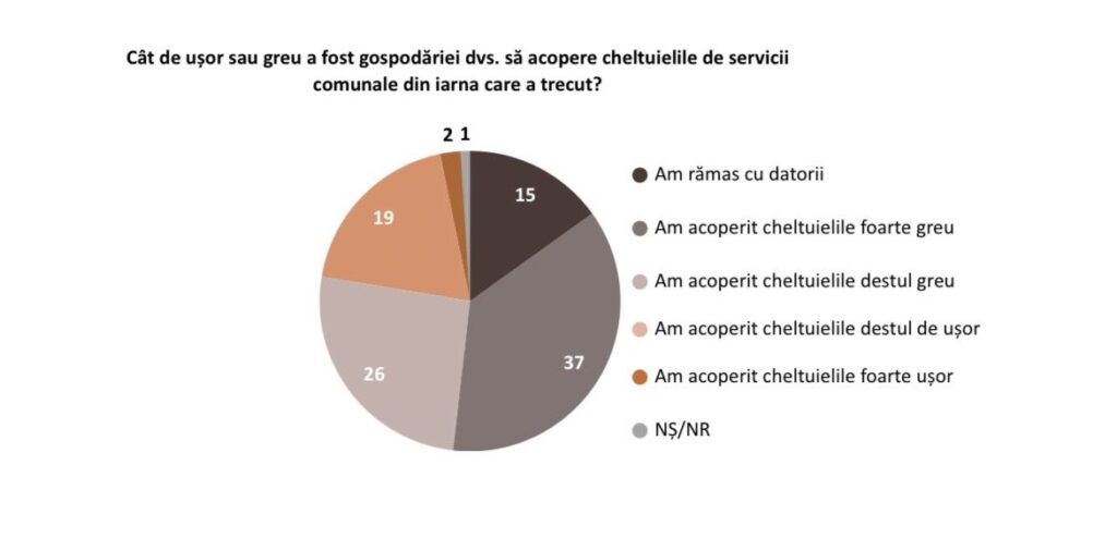 Cercetarea sociologică arată că o majoritate covârșitore a cetățenilor moldoveni au trecut greu de această iarnă. 15% din cei intervievați spun că au rămas cu datorii din cauza prețurilor și facturilor umflate, iar 63 la sută spun că au acoperit „foarte greu” sau „destul de greu” cheltuilelile pentru întreținere.