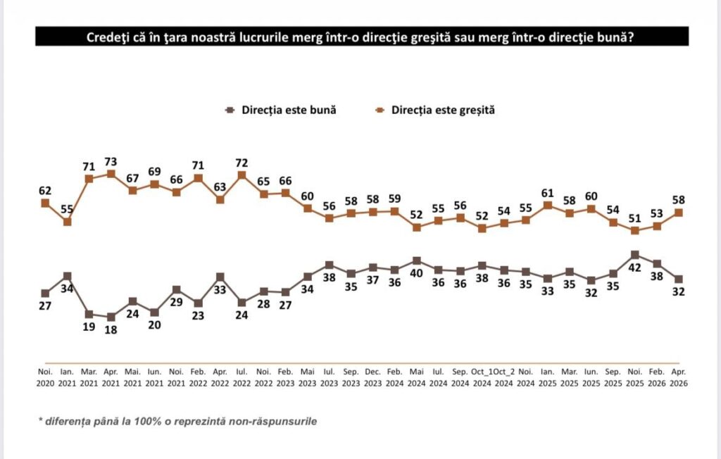 În cifre exacte, studiul arată că 58% dintre respondenți nu sunt de acord cu evoluțiile actuale, în timp ce, cu nici două luni în urmă, numărul acestora era de 53%. Același lucru se petrece și în sens invers. Doar 32% cred că direcția în care se îndreaptă Republica Moldova este corectă, față de 38% în februarie.