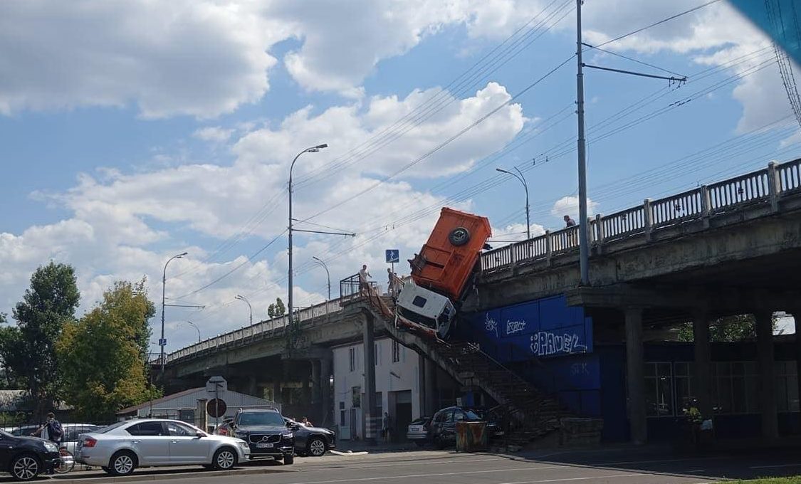 Accident grav în Capitală! O autospecială de transportare a gunoiului a spart gardul de protecție a podului din strada Ismail și e pe cale să se prăbușească în gol. Nu