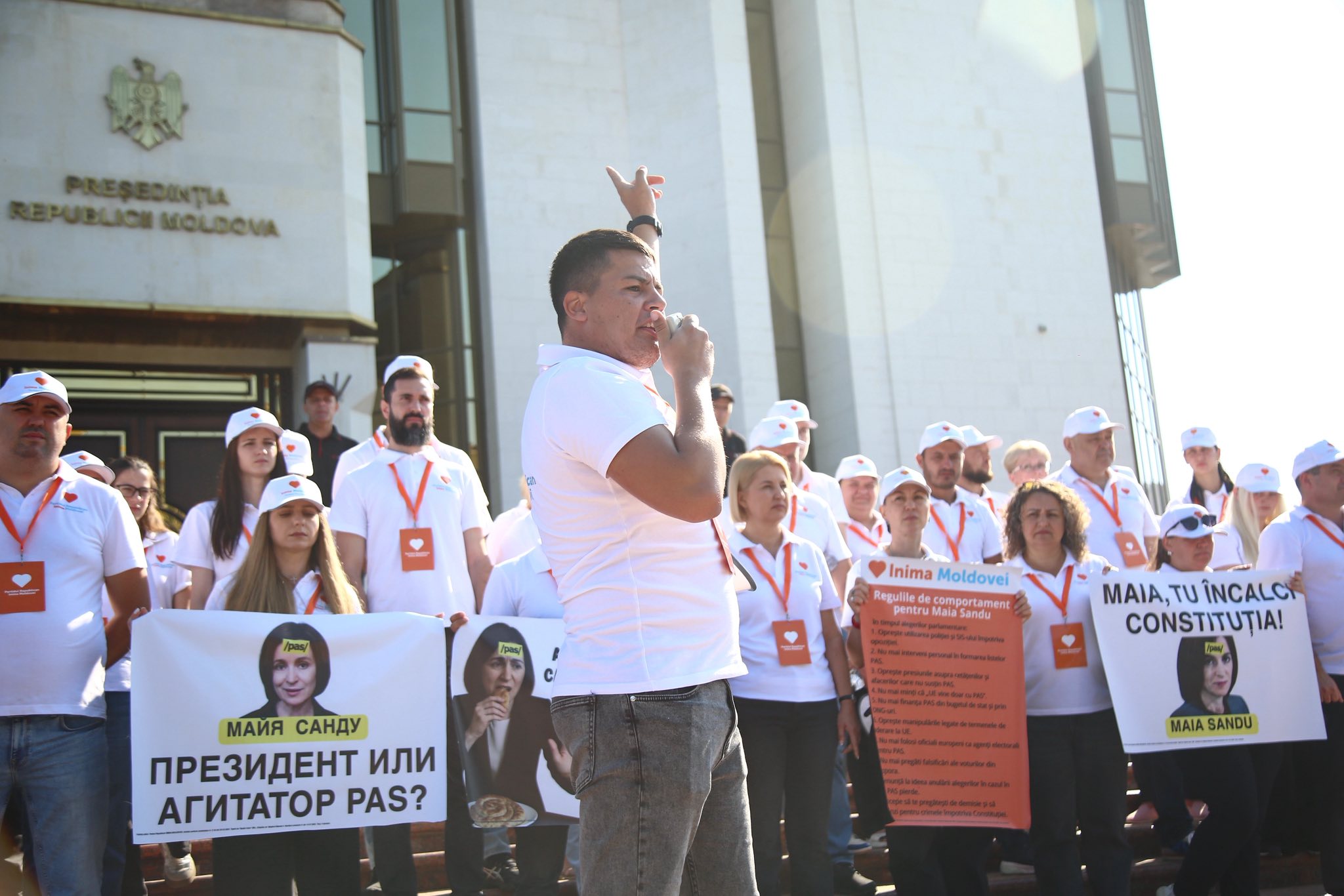Un grup de susținători ai Partidului „Inima Moldovei” au protestat azi la Președinție față de „implicarea flagrantă” a Maiei Sandu în promovarea PAS pentru alegerile parlamentare. Manifestanții au venit cu