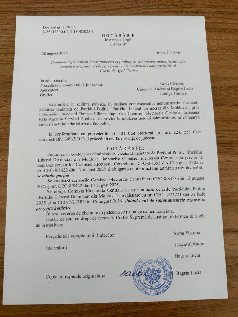 Ședința de judecată a fost reluată astăzi, 28 august, la ora 10:00, iar magistrații de la Apel examinat cauza care se referă la refuzul CEC de a include PLDM în lista concurenților electorali pentru alegerile parlamentare programate la 28 septembrie.